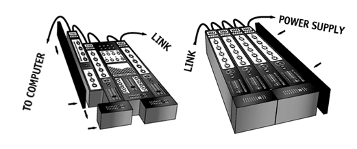 Ejemplo de montaje ensamblado y conexionado del equipo Esta ilustración muestra como se realiza el montaje, ensamblado y conexionado entre módulos ya sean de manera pareada o por separado mediante la unión de cableado específico. Está provisto de tapas laterales fabricadas de materiales elásticos para absorber las vibraciones y para proteger de los posibles golpes con el resto de los equipos adyacentes. Existe la posibilidad de su montaje en rack de 19" mediante tapas específicas. |